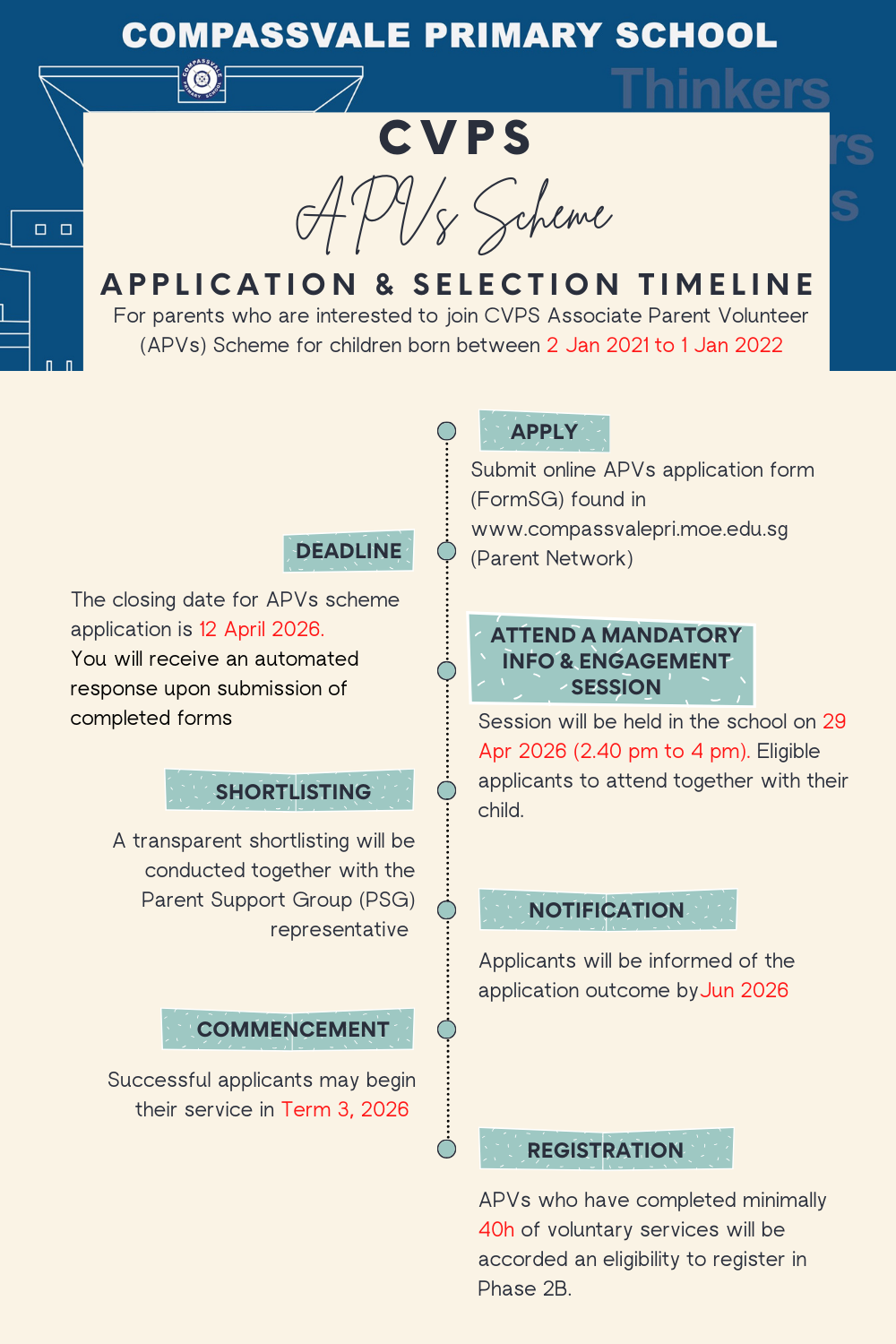 Please note that eligible applicants will be required to attend a mandatory information and engagement session on 29 April 2026, 2.40pm to 4pm. The session is designed for both parent(s) and child, and attendance is required. Special hands-on activities led by teachers will be conducted to provide your child with an immersive Compassvale experience. Attendance is part of the application process. Further details will be sent to eligible applicants via email closer to the date.